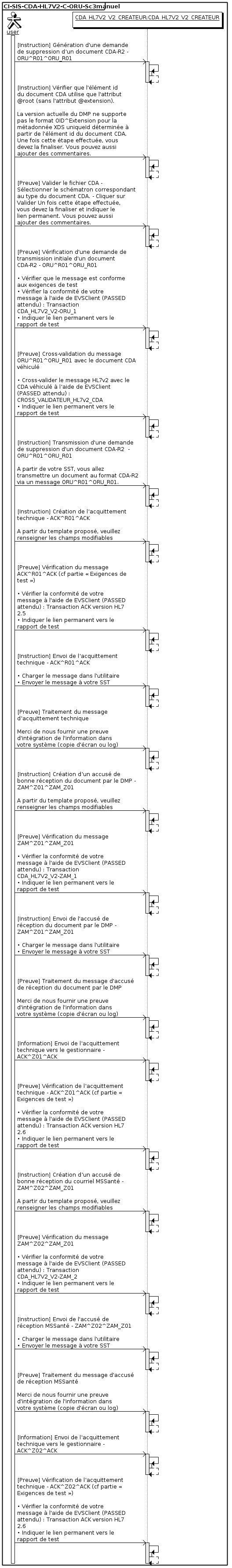 Ce scénario de test s'assure que le Créateur (système sous test [SST]) est capable de transmettre une demande de suppression d'un document au format CDA-R2 par un message HL7v2 ORU^R01^ORU_R01 valide. Ce scénario vérifie également que le Créateur (système sous test) prend en compte les accusés de réception DMP et MSSanté reçu.